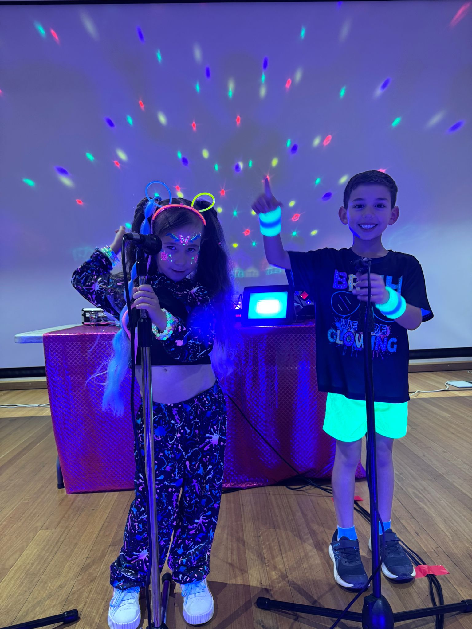 Always have a wet weather plan if your event is outdoors. We also find that outdoor discos don’t seem to work as well as indoor discos. Children tend to get easily distracted in big open spaces. If you really want to have your event outdoors, we do have some regulations to comply with for our Public Liability Insurance. We cannot set up on grass as all electrical cords must be taped down and both the equipment and children must be undercover. If your event is during the day, all the children need to wear hats, sunscreen and have regular drink breaks.